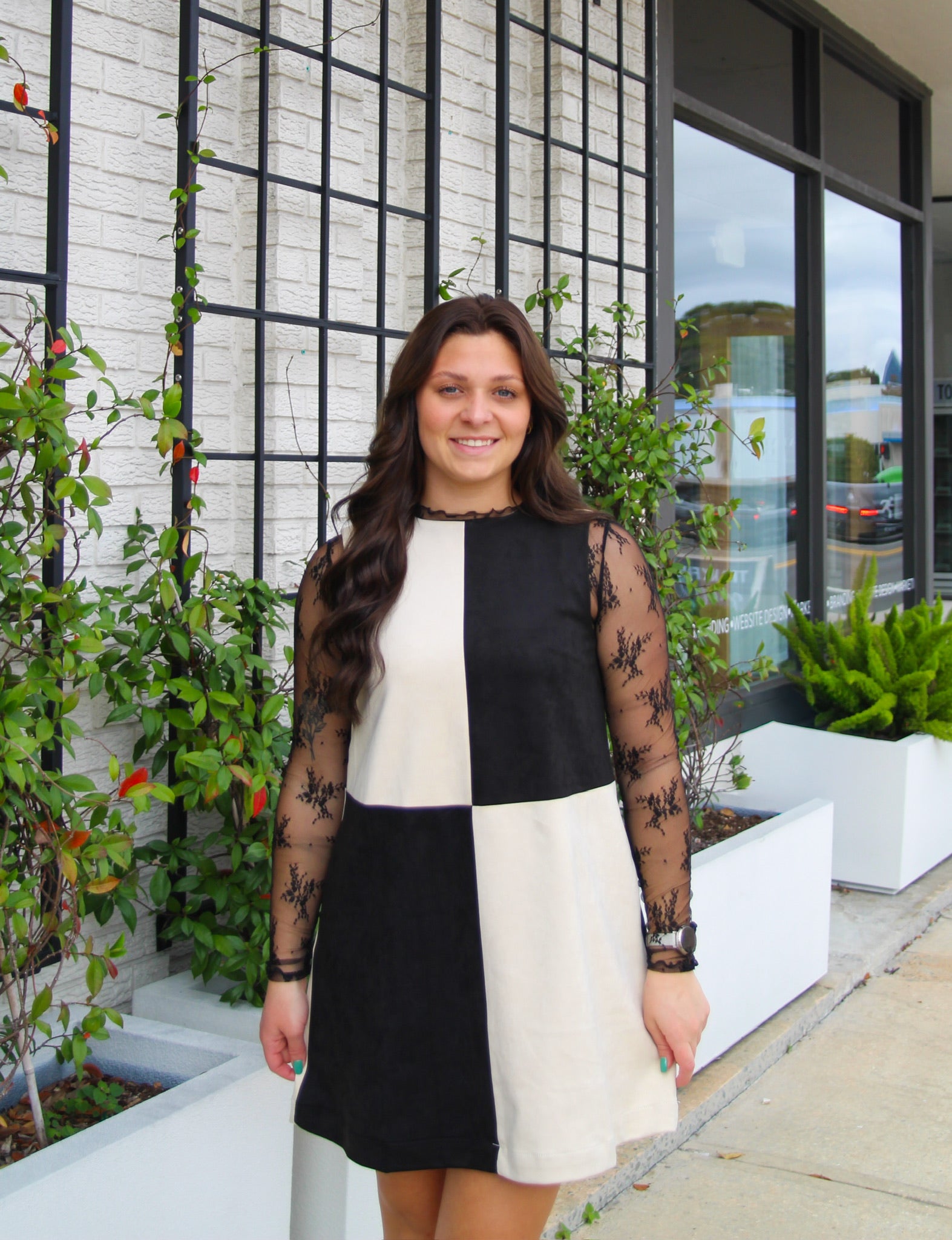 Make a statement with our Suede Contrast Shift Dress — a timeless blend of retro charm and modern sophistication. Crafted from luxuriously soft faux suede, this sleeveless A-line dress features a striking black and cream block pattern that’s effortlessly chic. The classic high neckline and above-the-knee length create a flattering silhouette that transitions seamlessly from day to night.