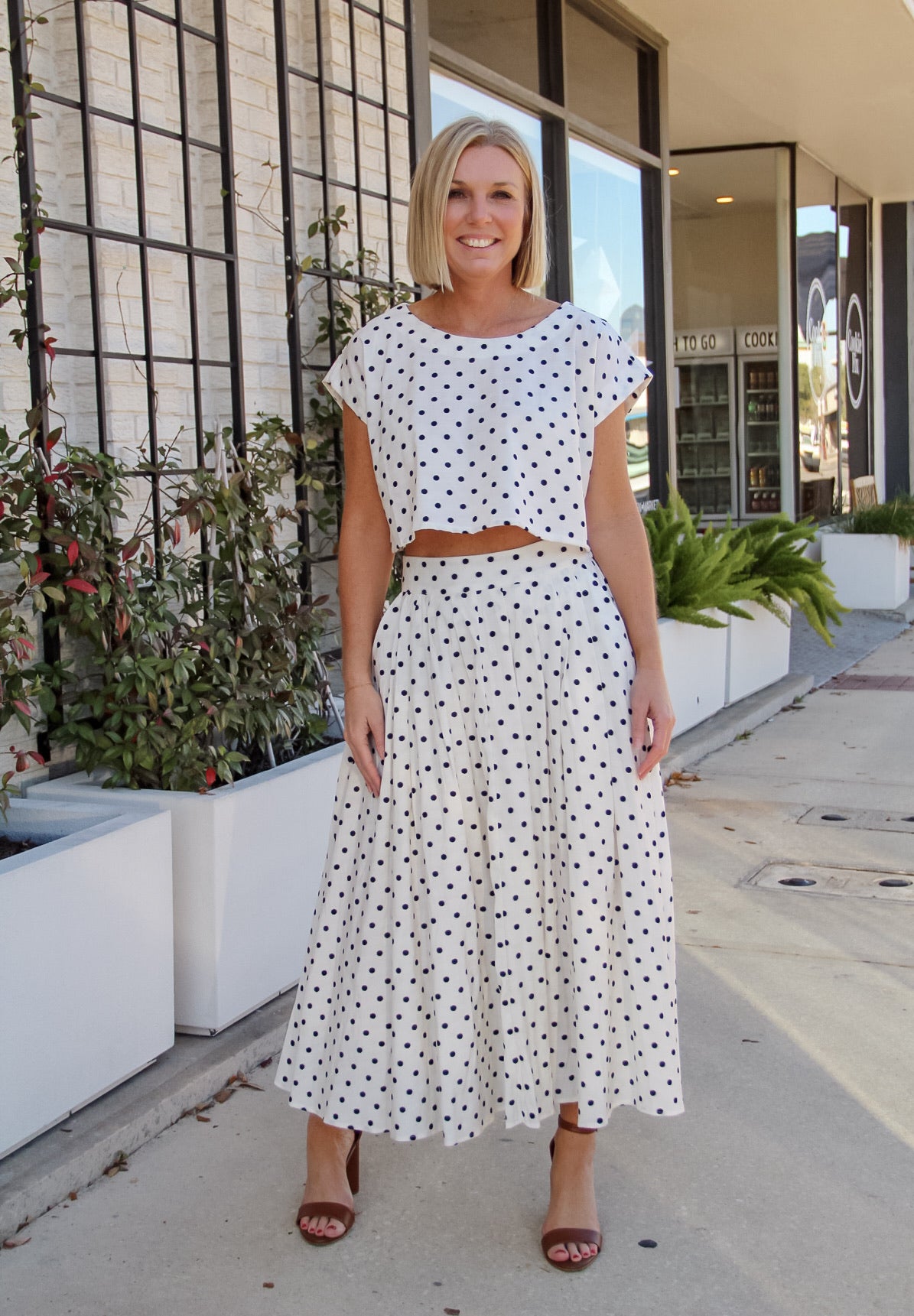This white polka dot cropped top features a relaxed, boxy silhouette with short sleeves for an effortless fit. The lightweight fabric drapes beautifully, while the subtle crop hits just right when paired with high-waisted bottoms. Finished with a classic round neckline, this top is easy to style on its own or as part of the matching set.